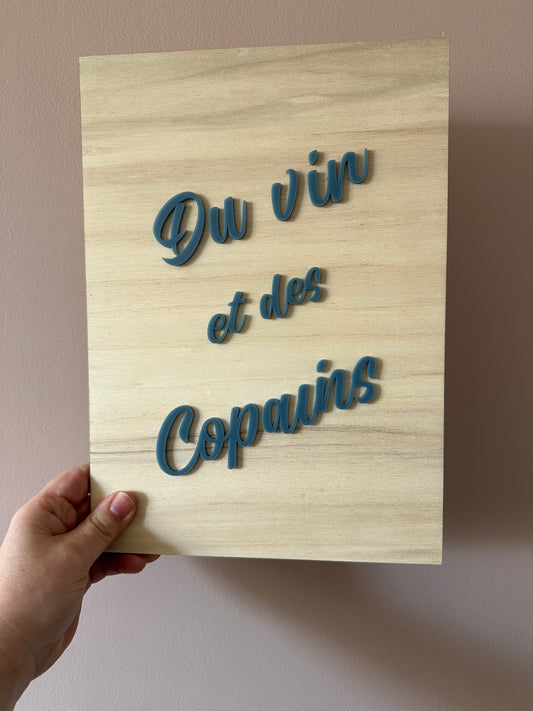 Affiche en Bois " Du vin et des copains "