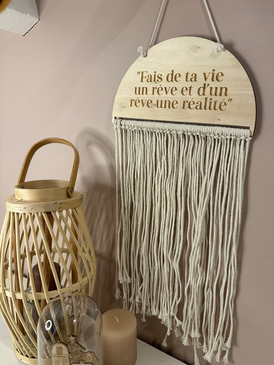 Pancarte en Bois Gravée : Fais de ta vie un rêve et d'un rêve une réalité avec Franges Macramé