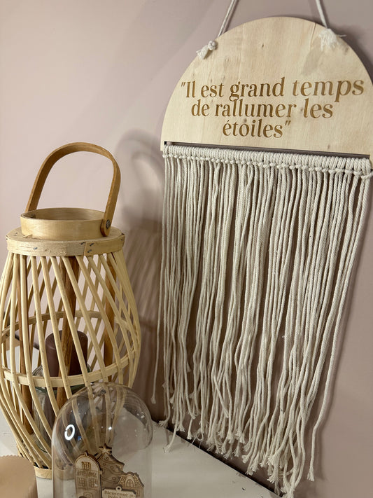 Pancarte en Bois Gravée 'Il est Grand Temps de Rallumer les Étoiles' avec Franges Macramé
