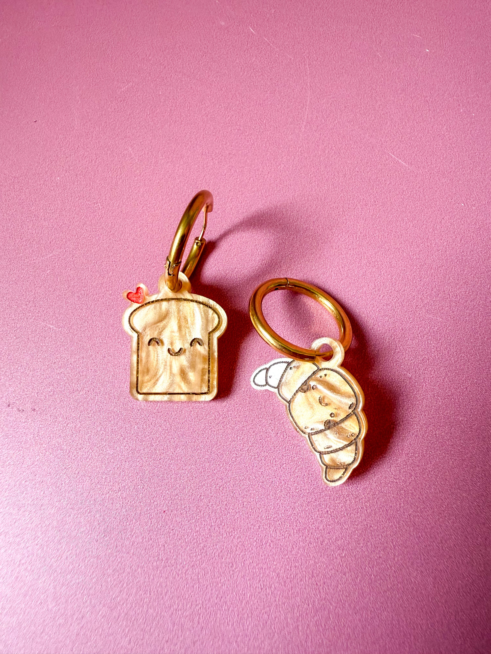 Craquez pour cette paire de crĂ©oles asymĂ©triques et ultra originales : un croissant dorĂ© tout mignon sur une oreille, une tartine avec petit cĆur sur lâautre. Le tout avec un visage kawaii, peint Ă la main avec amour, pour un look Ă croquer. đ„°